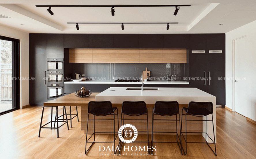 Mẫu nội thất nhà bếp đẹp hiện đại hài hòa về màu sắc và chất liệu