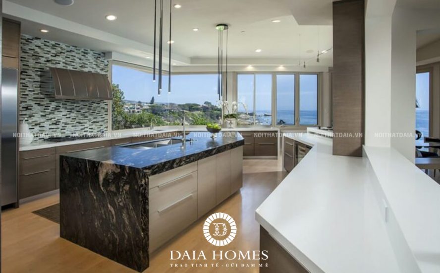 Mẫu nội thất nhà bếp hiện đại này gây chú ý với không gian rộng rãi, cách bài trí sang trọng sử dụng tủ bếp lớn theo kiểu chữ U. Kết hợp đảo bếp lớn sử dụng mặt đá sang trọng. Ngoài ra bức tường kính xung quanh cho tầm nhìn lớn và rộng. Đây sẽ là thiết kế phù hợp cho những ngôi biệt thự bên bờ biển thơ mộng và tuyệt đẹp.