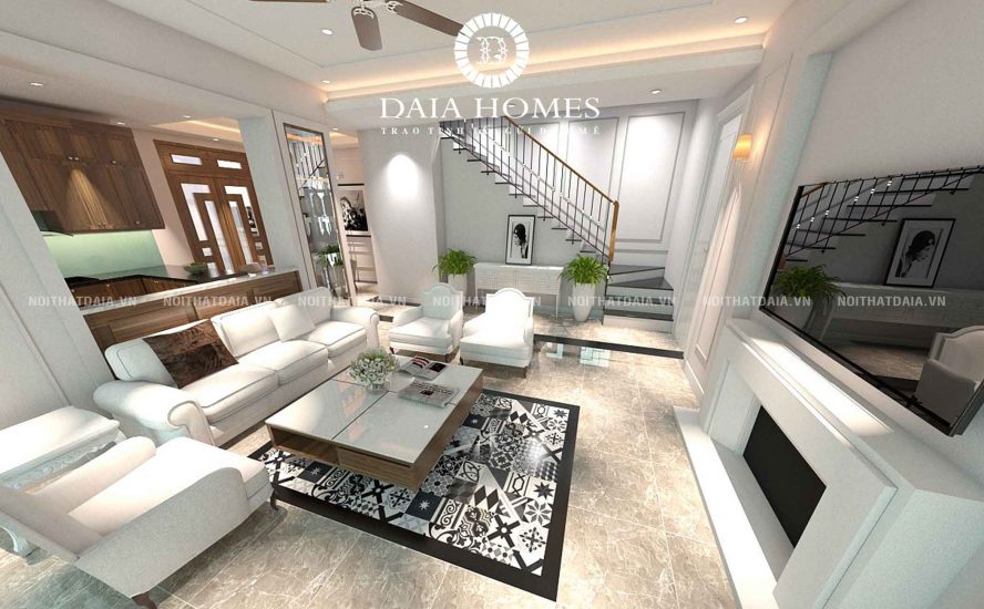 Thiết kế nội thất phòng khách đẹp với vật liệu sàn sạch sẽ, bắt mắt.